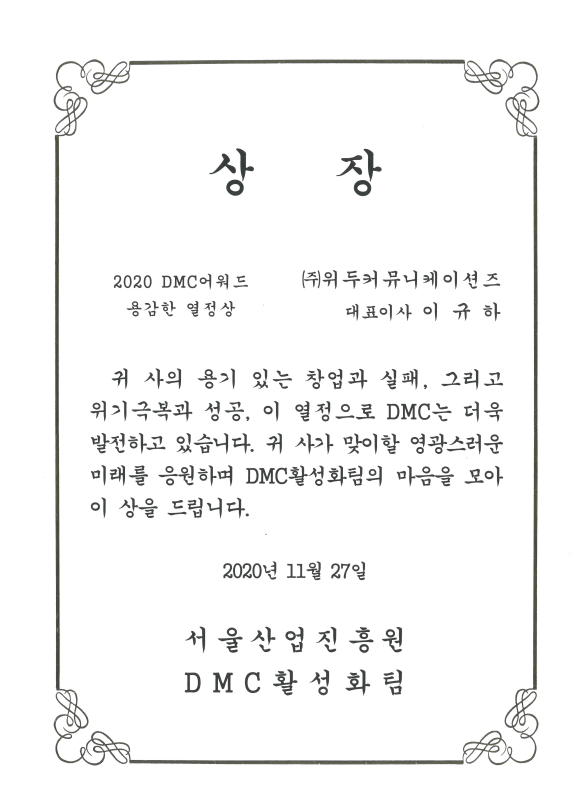 2020 서울산업진흥원 2020 DMC어워드 페이지 정보 작성자 WeDu 댓글 0건 조회 5,988회 작성일 21-12-31 12:57 본문 2020-11-27 2020 DMC어워드 용감한 열정상 서울산업진흥원 DMC활성화팀 List Previous2020 기술혁신 우수기업 21.12.31 Next2018 소년한국 우수 어린이 도서 19.05.30