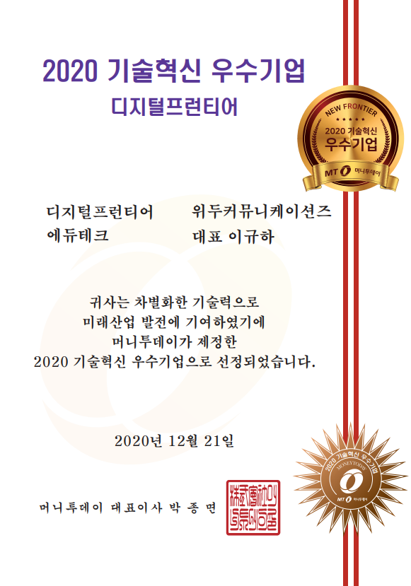 2020 기술혁신 우수기업 페이지 정보 작성자 WeDu 댓글 0건 조회 6,496회 작성일 21-12-31 12:58 본문 2020-12-21 2020 기술혁신 우수기업 디지털프런티어 에듀테크 머니투데이 대표이사 List Previous2020 소년한국 우수 어린이 도서 선정 21.12.31 Next2020 서울산업진흥원 2020 DMC어워드 21.12.31