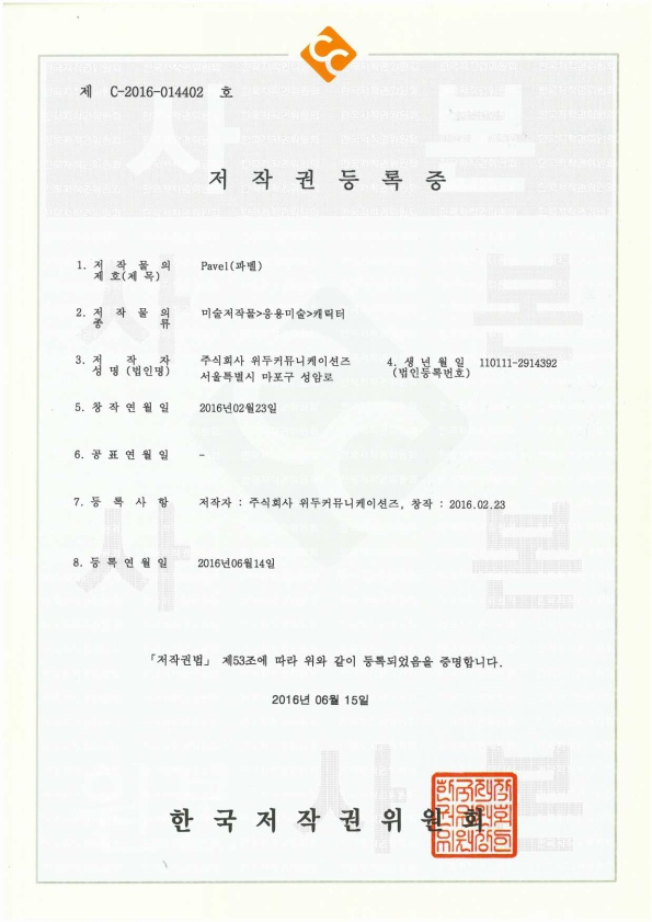 [한국/저작권] 파벨 페이지 정보 작성자 WeDu 댓글 0건 조회 6,415회 작성일 19-05-30 19:11 본문 2016-06-15 저작권 C-2016-014402 파벨 / 미술저작물>응용미술>캐릭터 List Previous[한국/저작권] 누미 19.05.30 Next[한국/저작권] 월터 19.05.30