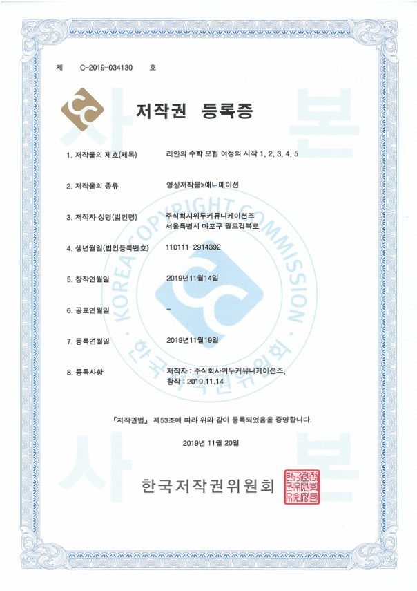 [한국/저작권] 리안의 수학 모험 여정의 시작 1,2,3,4,5 페이지 정보 작성자 WeDu 댓글 0건 조회 6,222회 작성일 21-12-31 12:36 본문 2019-11-20 저작권 C-2019-034130 영상저작물>애니메이션 List Previous[한국/저작권] OLL KIDS/MATH 21.12.31 Next[한국/저작권] 리안의 수학 모험 애니메이션 OST 19.11.25