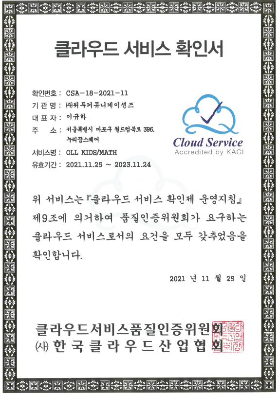 [한국/인증서] OLL KIDS/MATH 클라우드 서비스 확인서 페이지 정보 작성자 WeDu 댓글 0건 조회 10,084회 작성일 21-12-31 12:46 본문 2021-11-25 확인번호 CSA-18-2021-11 서비스명 : OLL KIDS/MATH List Previous[한국/확인서] OLL KIDS/MATH 파스-타 호환성 확인서 21.12.31 Next[한국/저작권] 장보기 인지훈련 게임 21.12.31