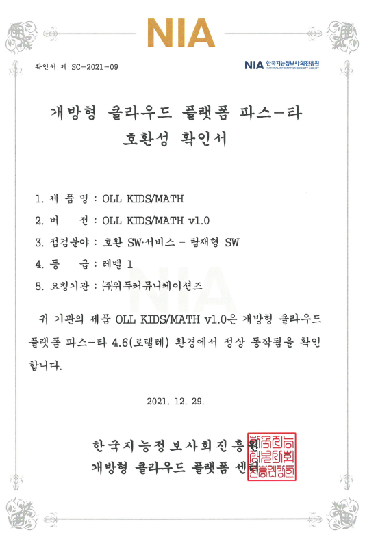 [한국/확인서] OLL KIDS/MATH 파스-타 호환성 확인서 페이지 정보 작성자 WeDu 댓글 0건 조회 10,747회 작성일 21-12-31 12:48 본문 2021-12-29 확인서 제 SC-2021-09 점검분야 : 호환 SW서비스 - 탑재형 SW List Next[한국/인증서] OLL KIDS/MATH 클라우드 서비스 확인서 21.12.31